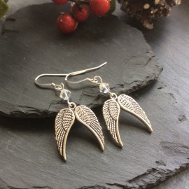 Sterling Silver earwires, Swarovski crystal or Preciosa Crystal with a Tibetan Angel Wings charm pair of earrings. Supplied in a white organza gift bag.