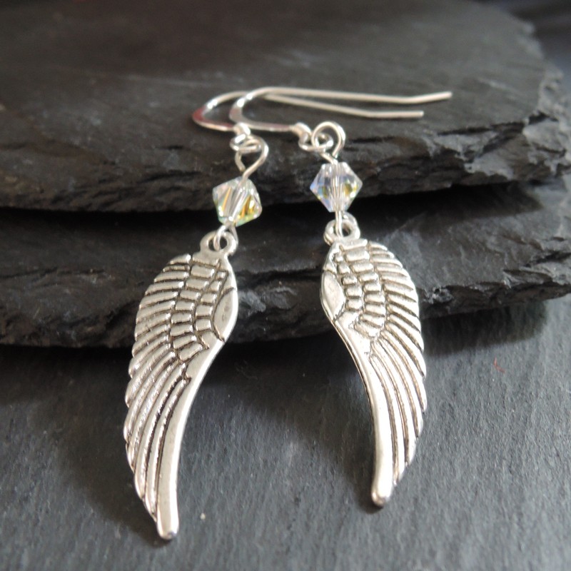 Sterling Silver earwires, Swarovski crystal or Preciosa Crystal with a Tibetan Angel Wing charm pair of earrings. Supplied in a white organza gift bag.