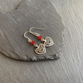 Sterling Silver earwires, Swarovski crystal or Preciosa Crystal with a Tibetan Filigree Heart charm pair of earrings. Supplied in a white organza gift bag.